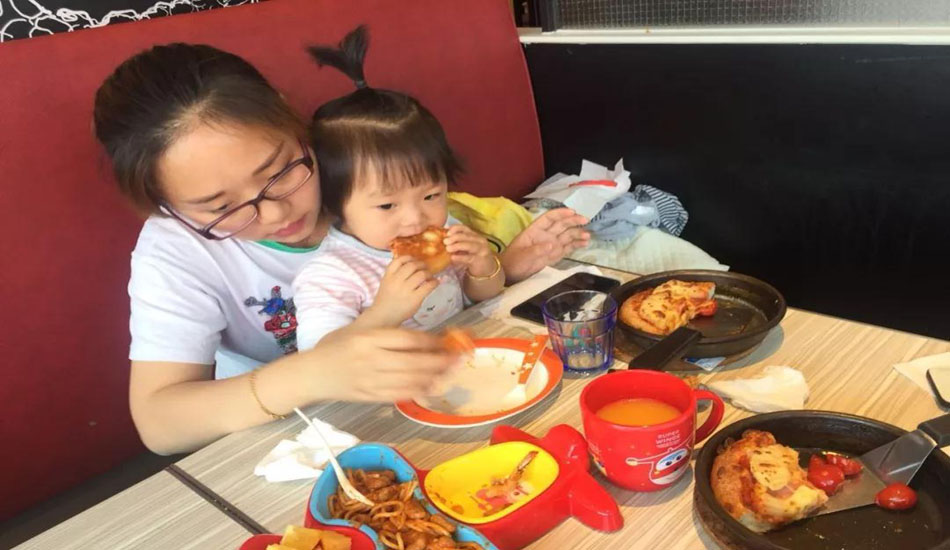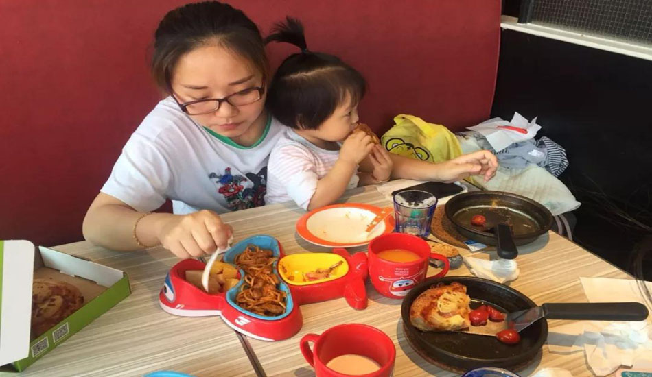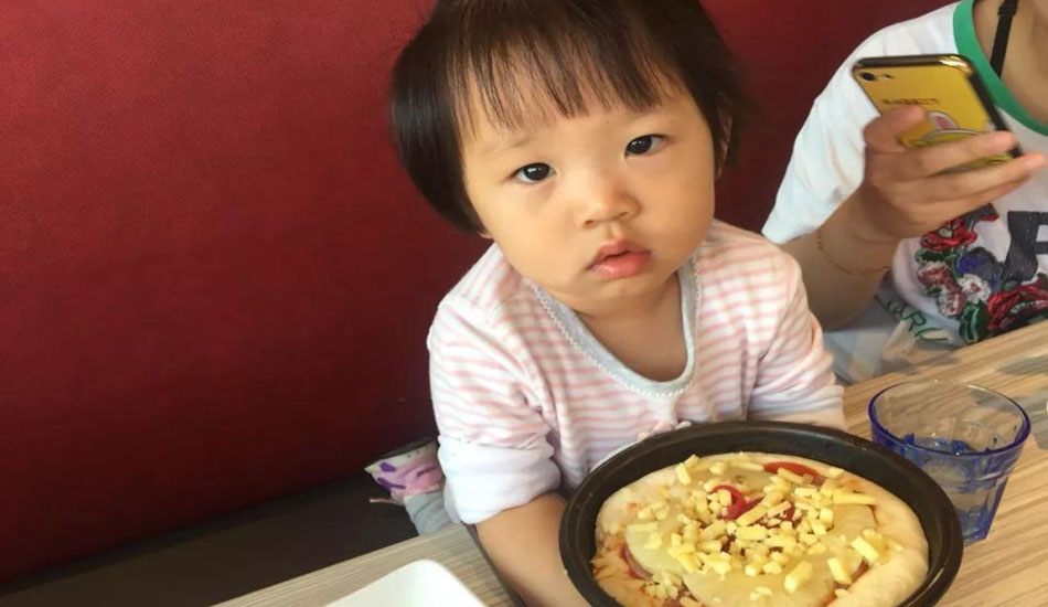 依依妈妈很认真的做着披萨,小依依也在旁边帮忙哦~