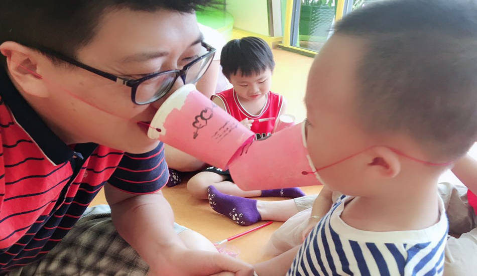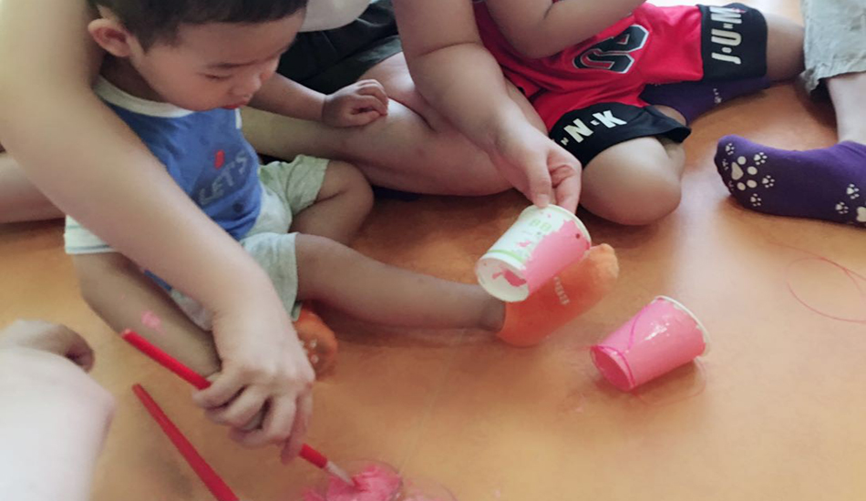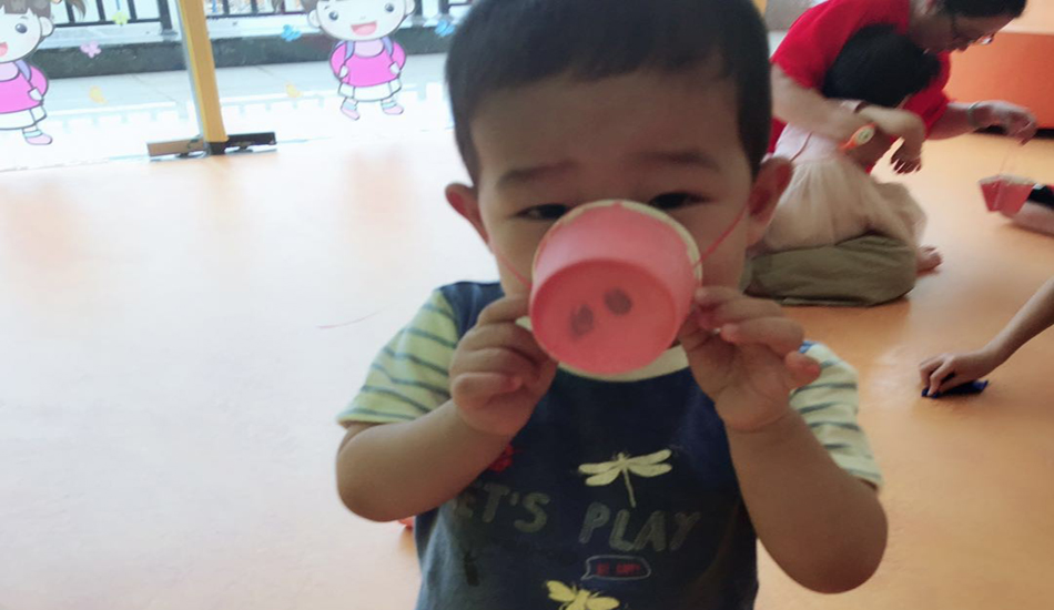 接下来我们要变成可爱的小猪一起去庆祝这个生日party,每组家庭都获得制作猪鼻子的材料,宝宝将颜料用刷子刷在被子上,完成后将猪鼻子带上。