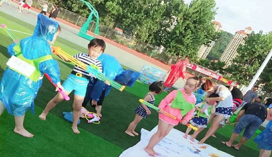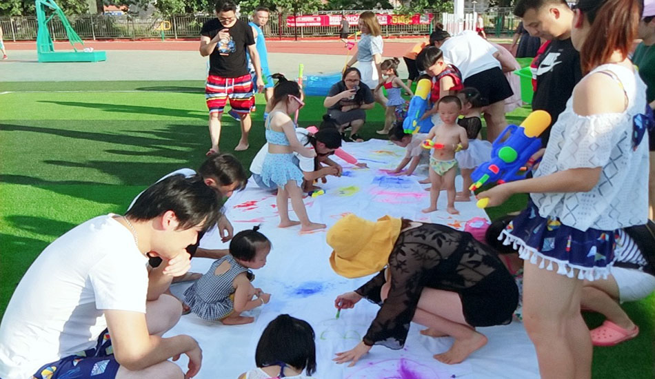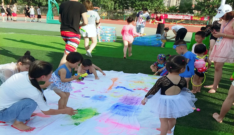 17点30分,我们变成了小小艺术家用水枪在百米画布上射水,然后用颜料在上面作画,在创作的过程中可以锻炼宝贝的想象力和创造力以及手部控制能力。喷绘出喜欢的图画。
