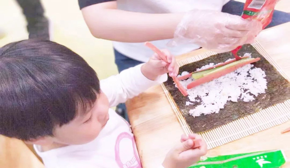 结束时装秀,进入旅行【第三站?韩国】,开启韩国寿司之旅。现场围绕韩国的寿司元素,宝贝们和爸爸妈妈一起亲手制作我们的美味寿司哦!瞧,我们有模有样的呢~